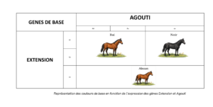 La détermination de la couleur de base d’un cheval va dépendre de deux gènes : Extension (E) et Agouti (A).